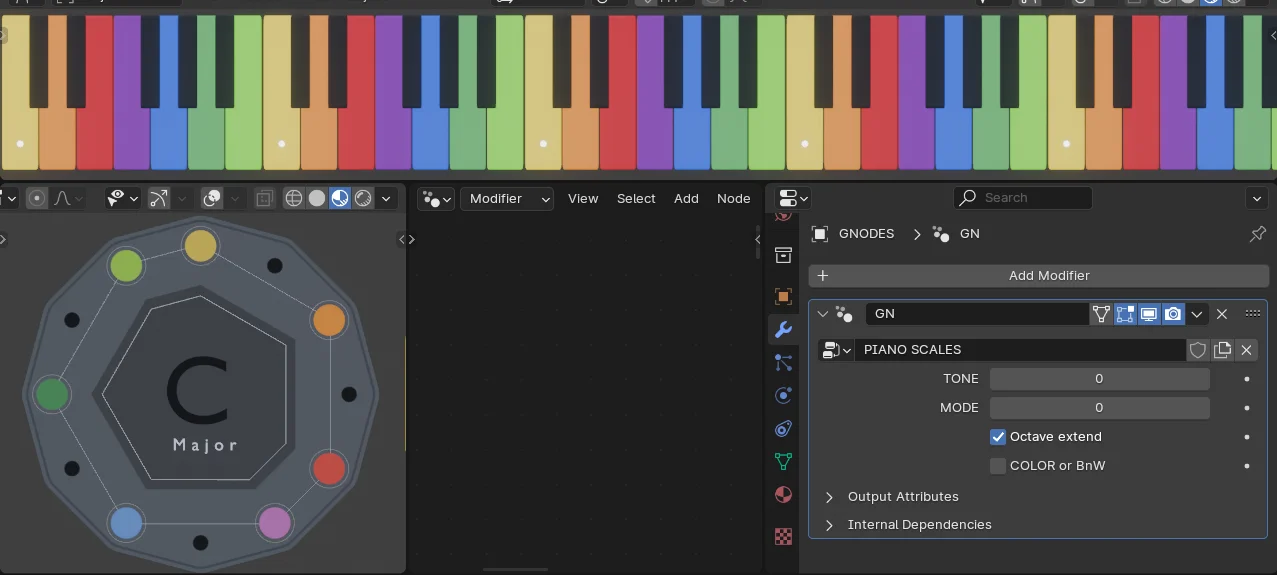 A Geometry Nodes system designed to visualize piano musical scales. The setup displays scales on a virtual keyboard using color-coded keys and text labels. Users can cycle through the different modes of each scale to support visual music theory learning and demonstration.