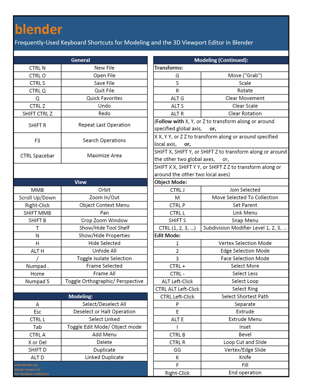 This quick reference guide is provided as a single-sheet PDF document detailing frequently used keyboard shortcuts for Blender. The sheet focuses specifically on essential command hotkeys for 3D modeling tasks and navigating the 3D Viewport editor.