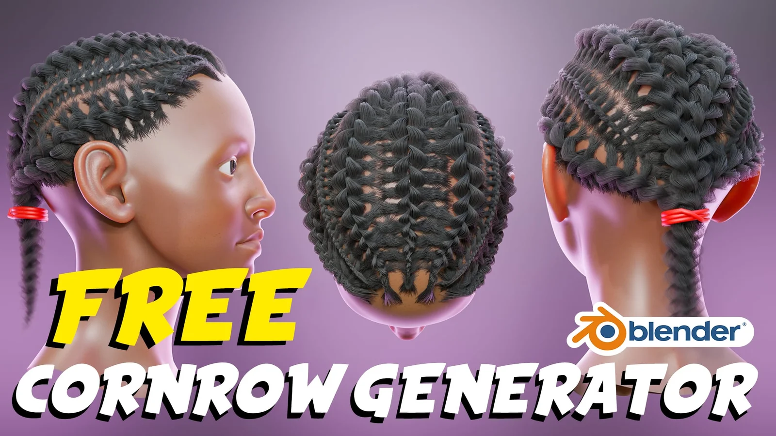 This geometry nodes setup generates procedural cornrow hair within Blender. Users draw curves inside an empty hair system, and the node tree automatically converts each curve into a single braided cornrow. The system includes customizable sliders to adjust the structure and appearance of the braids. Multiple empty hair systems can be applied to a single character model to create layered styles requiring varying braid thicknesses.