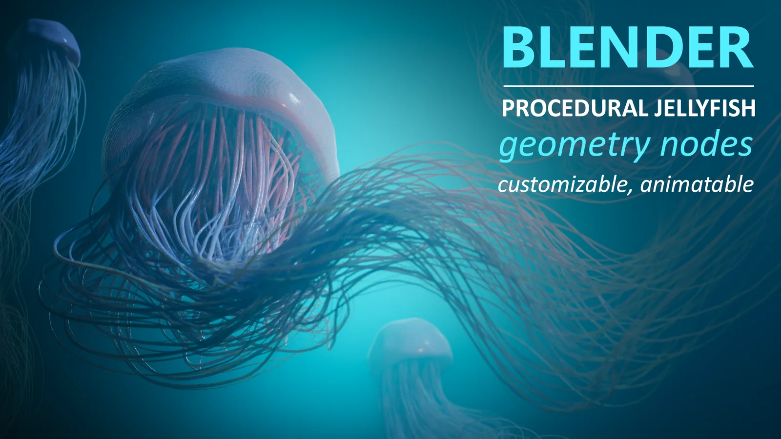 A Geometry Nodes setup for generating procedural jellyfish models in Blender. The tool provides parameters to customize the appearance of the models and includes functionality to animate their movement for underwater scenes and aquatic environments.