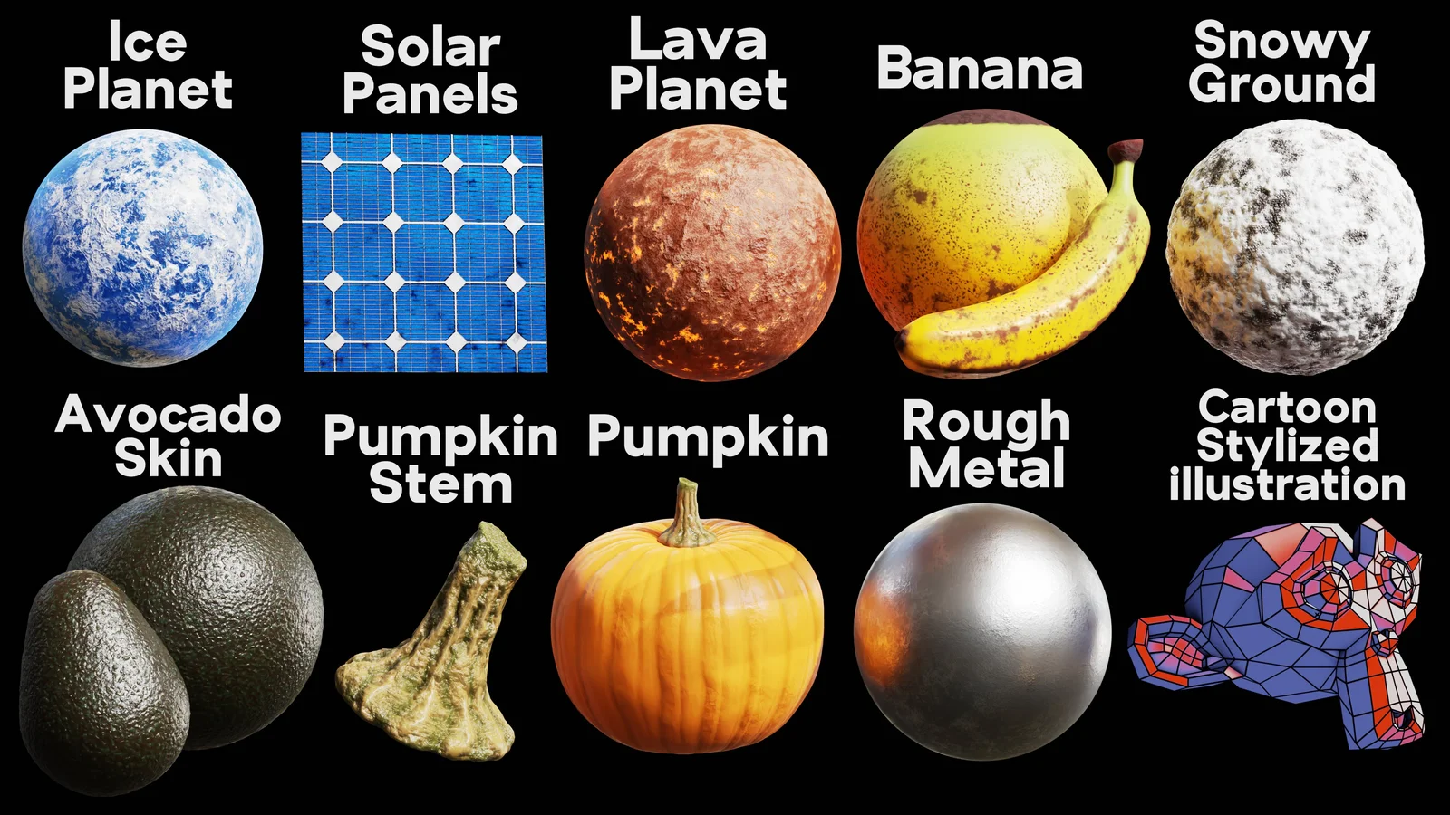 This collection provides 10 procedural materials created for the Cycles rendering engine. The pack features a variety of surfaces, including solar panels, rough metal, snowy ground, and organic textures like banana, avocado skin, and pumpkin surfaces utilizing displacement mapping.