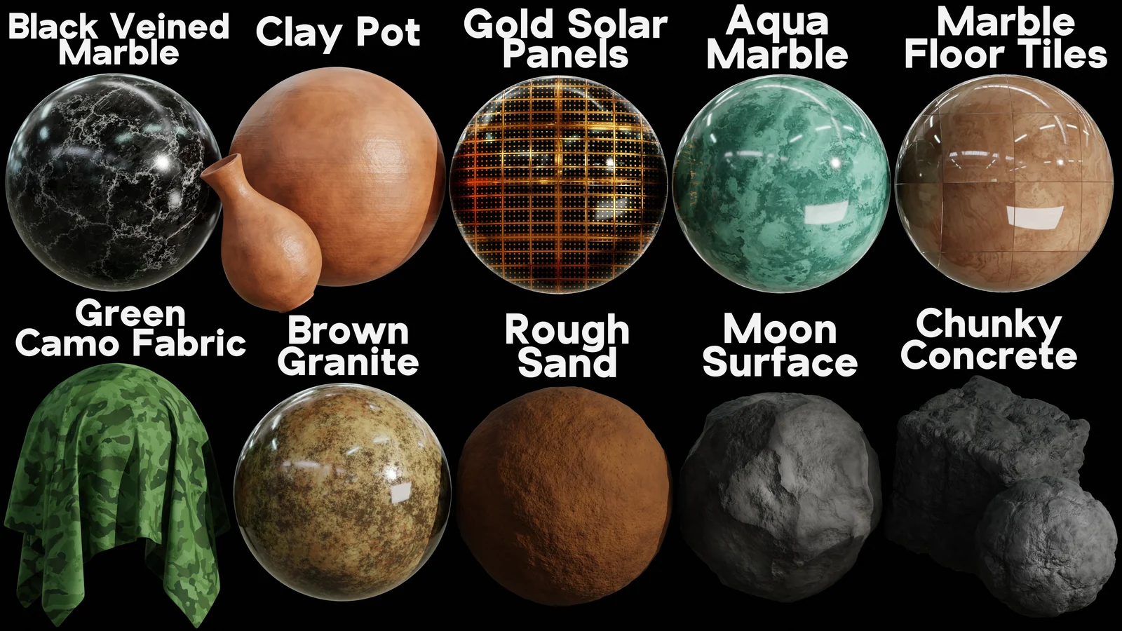 A collection of 10 realistic procedural materials created for Blender's Cycles render engine. Each material is built as a custom node group featuring exposed parameters to control scale, rotation, color, metallic properties, roughness, and normal intensity. The pack includes a variety of surfaces such as black veined marble, gold solar panels, green camo fabric, and chunky concrete. Certain materials like the rough sand, moon surface, and concrete utilize displacement mapping, which requires the Cycles render engine for full functionality.