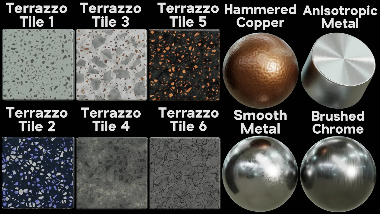 A collection of 10 realistic procedural materials built as custom node groups for Blender. The pack includes six variations of terrazzo tile alongside hammered copper, anisotropic metal, smooth metal, and brushed chrome. Each node group exposes customizable parameters, allowing users to easily adjust scale, rotation, color, metallic properties, roughness, and displacement values. Designed primarily for the Cycles render engine, these materials are also fully compatible with Eevee.