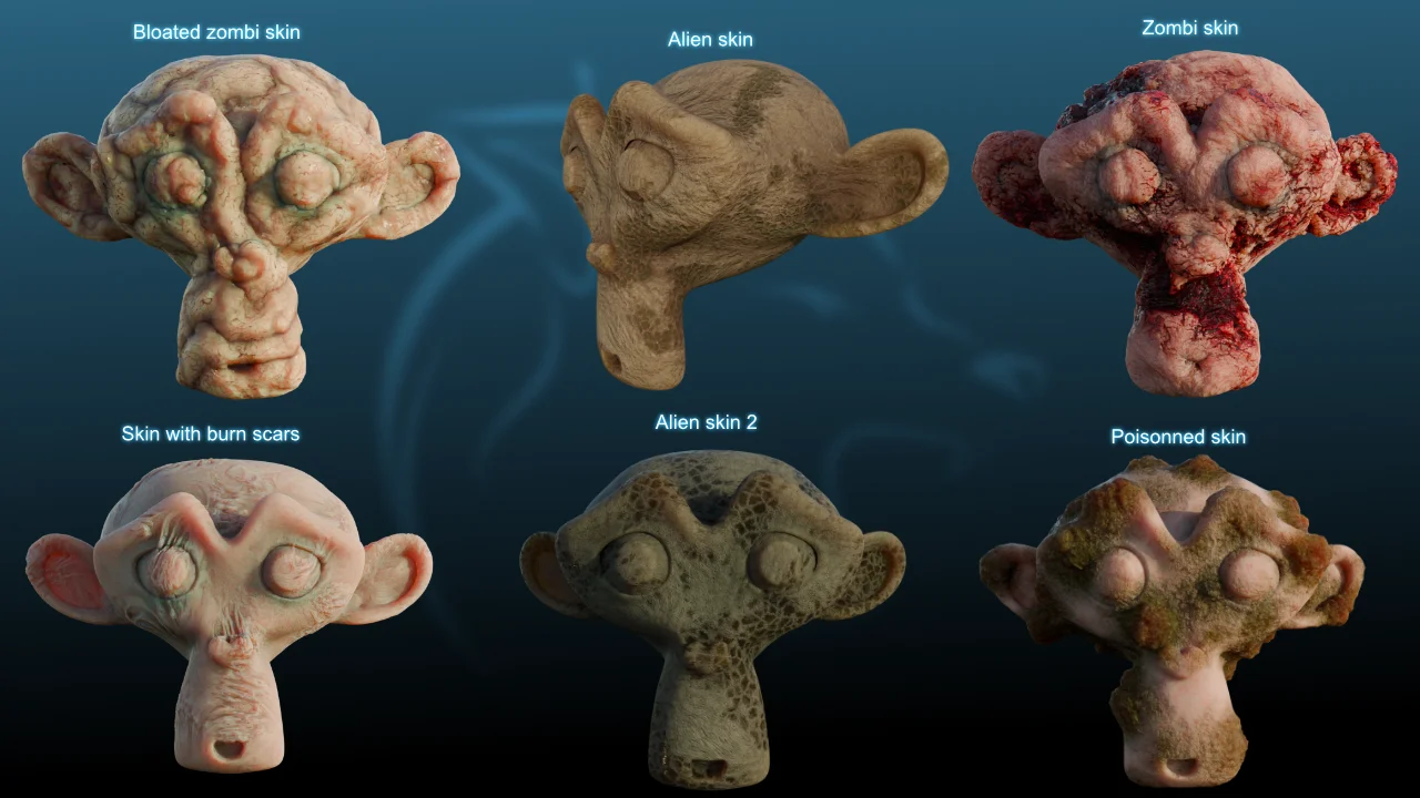 This pack provides six procedural horror-themed materials for Blender, including alien skin variations, bloated zombie skin, poisoned skin, and skin with burn scars. Designed for the Cycles render engine, the materials utilize object texture coordinates, eliminating the need for UV unwrapping out of the box.