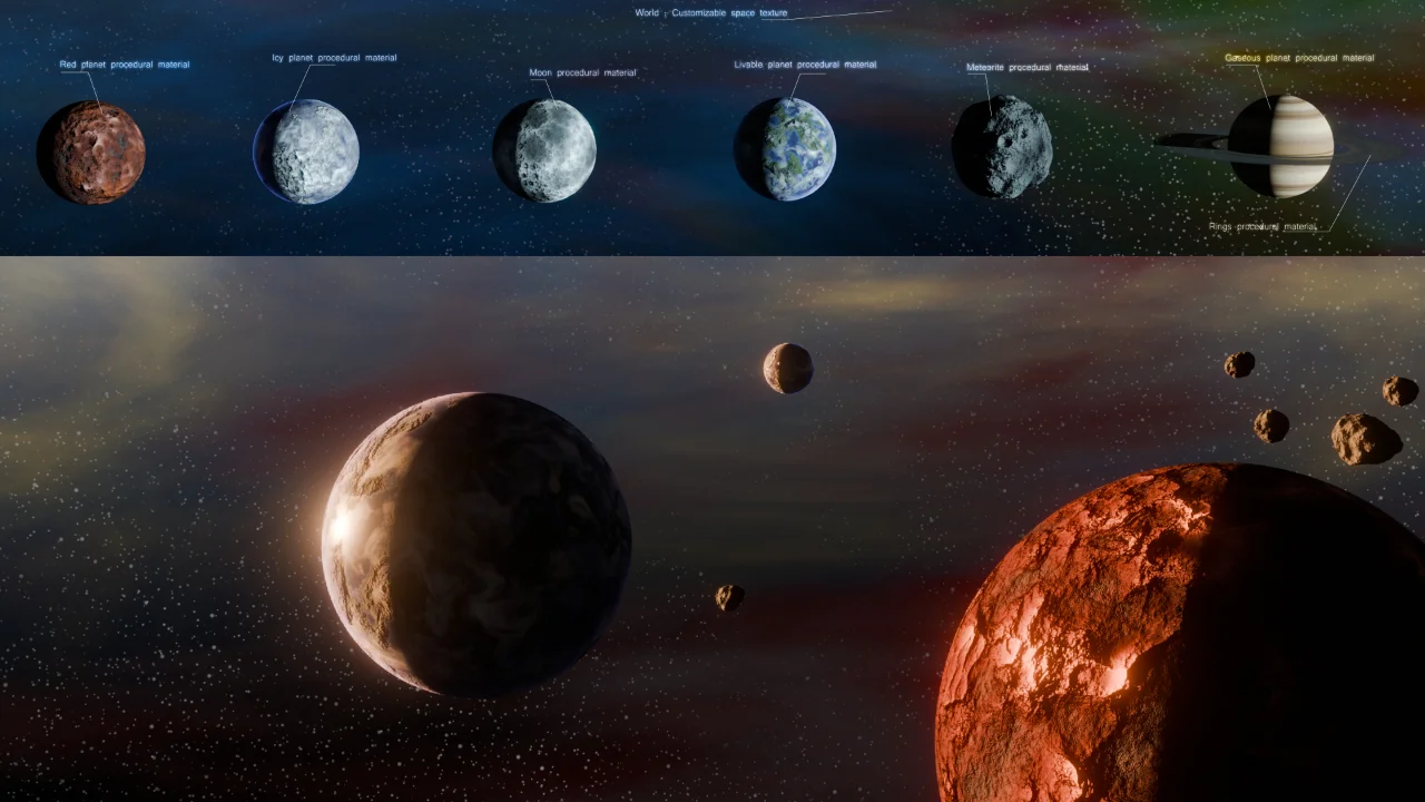 A collection of customizable procedural materials for creating space environments in Blender. The pack features four distinct planet types, including ice, red, liveable, and gaseous worlds. It also includes specific materials for a moon, planetary rings, and a meteorite setup that utilizes displacement. A procedural world space texture is provided for generating starfield backgrounds. All setups are organized within customizable node groups accessible in the Shader workspace.