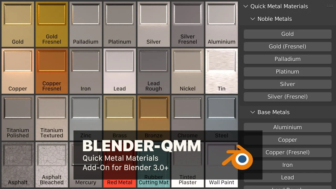 Quick Metal Materials (QMM) is an add-on that creates a dedicated panel in the 3D Viewport sidebar, allowing you to assign a variety of metal materials to selected objects with a single click. For alternative workflows, the material library is also provided as a standard Asset Browser file and a KPACK for KitOps integration.