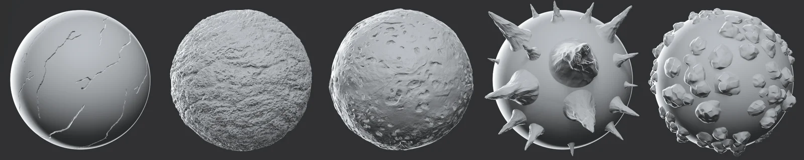 A collection of five vector displacement map (VDM) brushes designed for sculpting rock formations in Blender. The pack includes brushes themed around standard rocks, stalagmites, and crystals. These brushes utilize Blender's VDM capabilities to create complex, three-dimensional surface details during the sculpting process. This demo version is restricted to personal use.