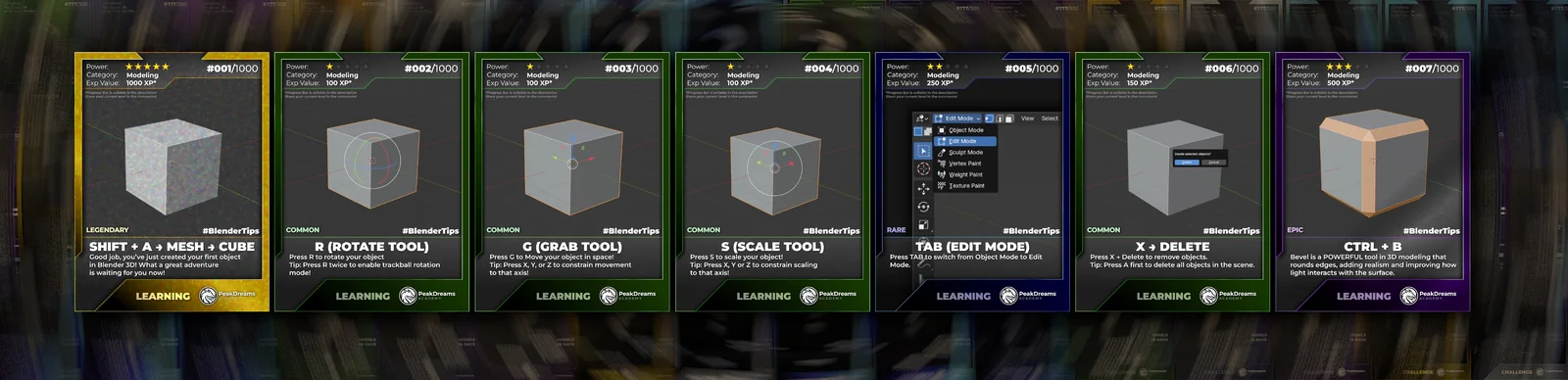 This collection provides 50 digital reference cards designed to help users learn and practice Blender. Delivered as PNG images, each card focuses on a specific skill, tool, workflow, or software shortcut. The deck serves as a quick reference guide that users can keep on hand to structure their learning and recall interface commands.