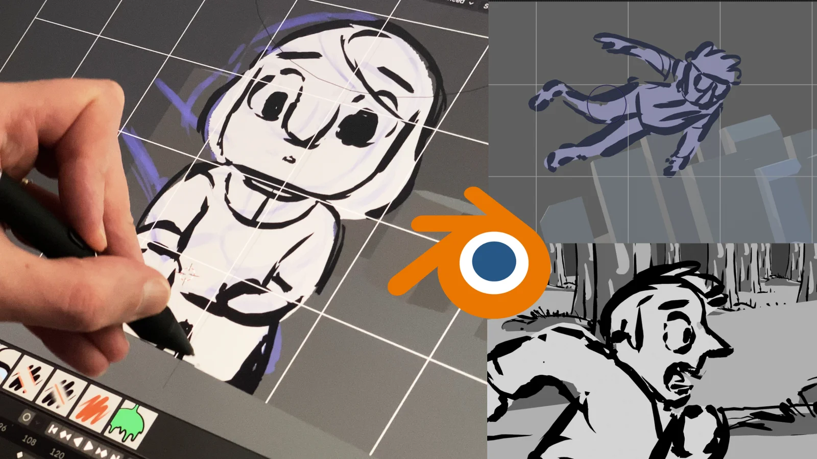This product contains three example Blender scenes demonstrating how to combine 2D and 3D elements for storyboarding and animatics. The files feature setups using Grease Pencil, serving as companion project files to a video guide on the subject. They are designed to be explored so users can study the construction of mixed 2D/3D scenes.