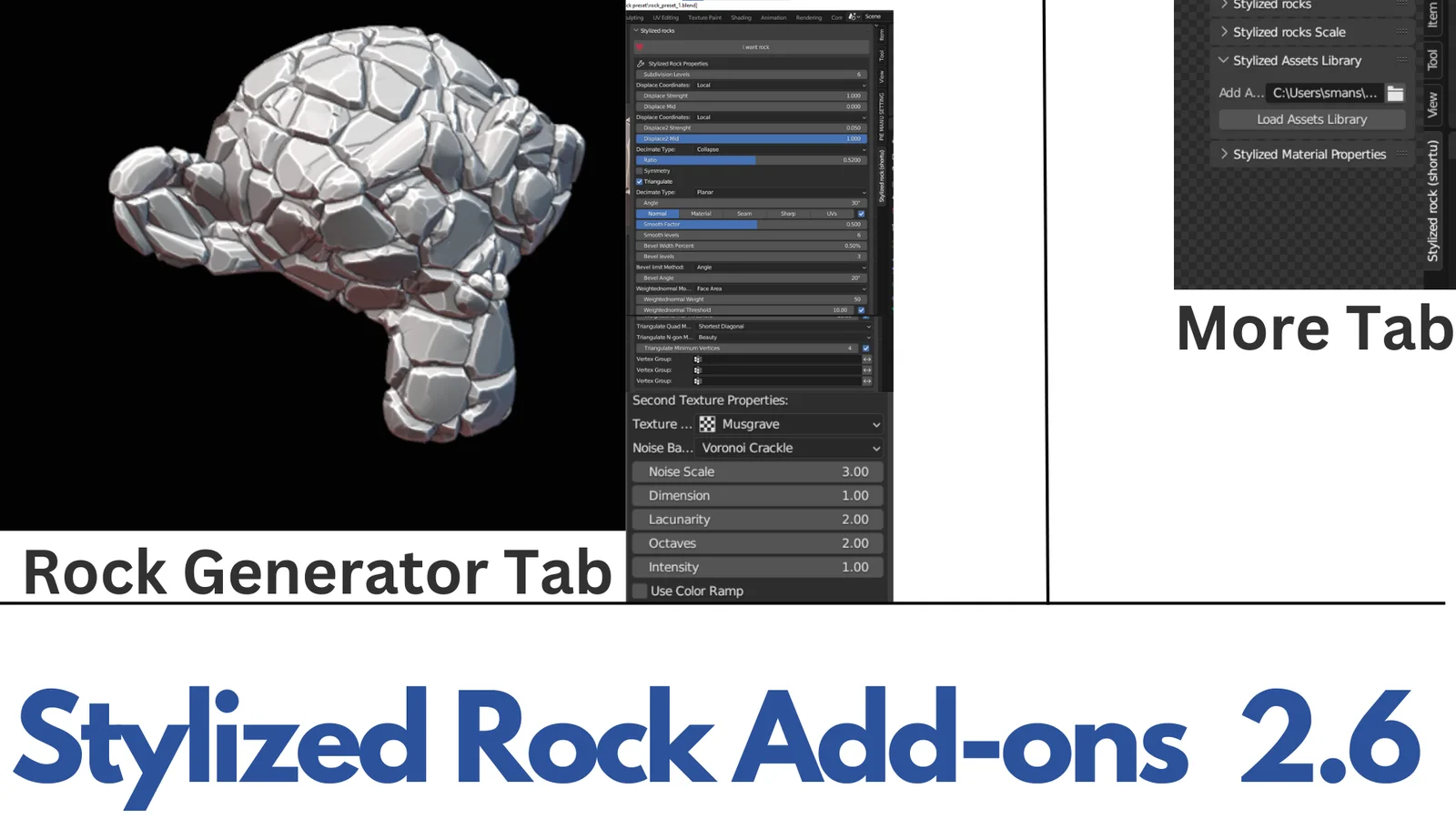 Stylized Rock is an add-on providing dedicated panels for generating and modifying stylized rock assets. It features a built-in stylized material library and an asset library loader for managing scene elements. The toolset includes distinct panels for lighting setups, rock scale manipulation, and active properties powered by a layered property system for further asset customization.