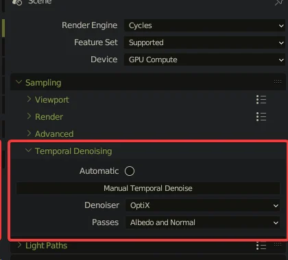 This add-on provides a user interface panel for Blender's native temporal denoising functionality, located under Render Properties > Sampling when Cycles is the active render engine. Temporal denoising helps reduce flickering in animated sequences by analyzing multiple frames during the denoising process.