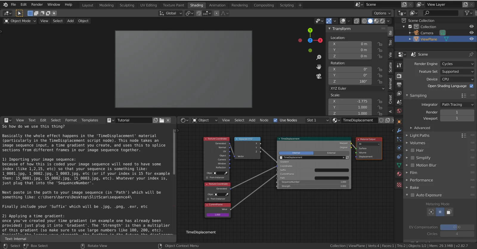 This product provides an Open Shading Language (OSL) material node setup designed to create time displacement effects in Blender. It accepts an input image sequence and applies an animatable time gradient to offset the frames. Because it relies on OSL, the material is exclusively compatible with the Cycles render engine. Higher framerate input sequences are recommended to ensure smoother interpolation.