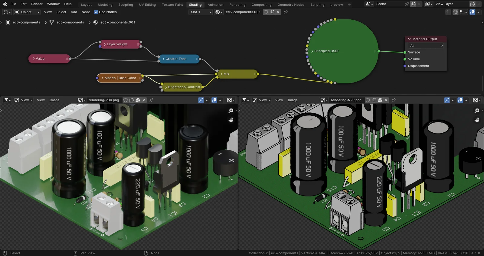 This written guide explains how to convert a standard 3D model with PBR textures into a non-photorealistic illustration. The tutorial details a specific node setup designed to replicate the visual style of vintage electronics magazine diagrams.