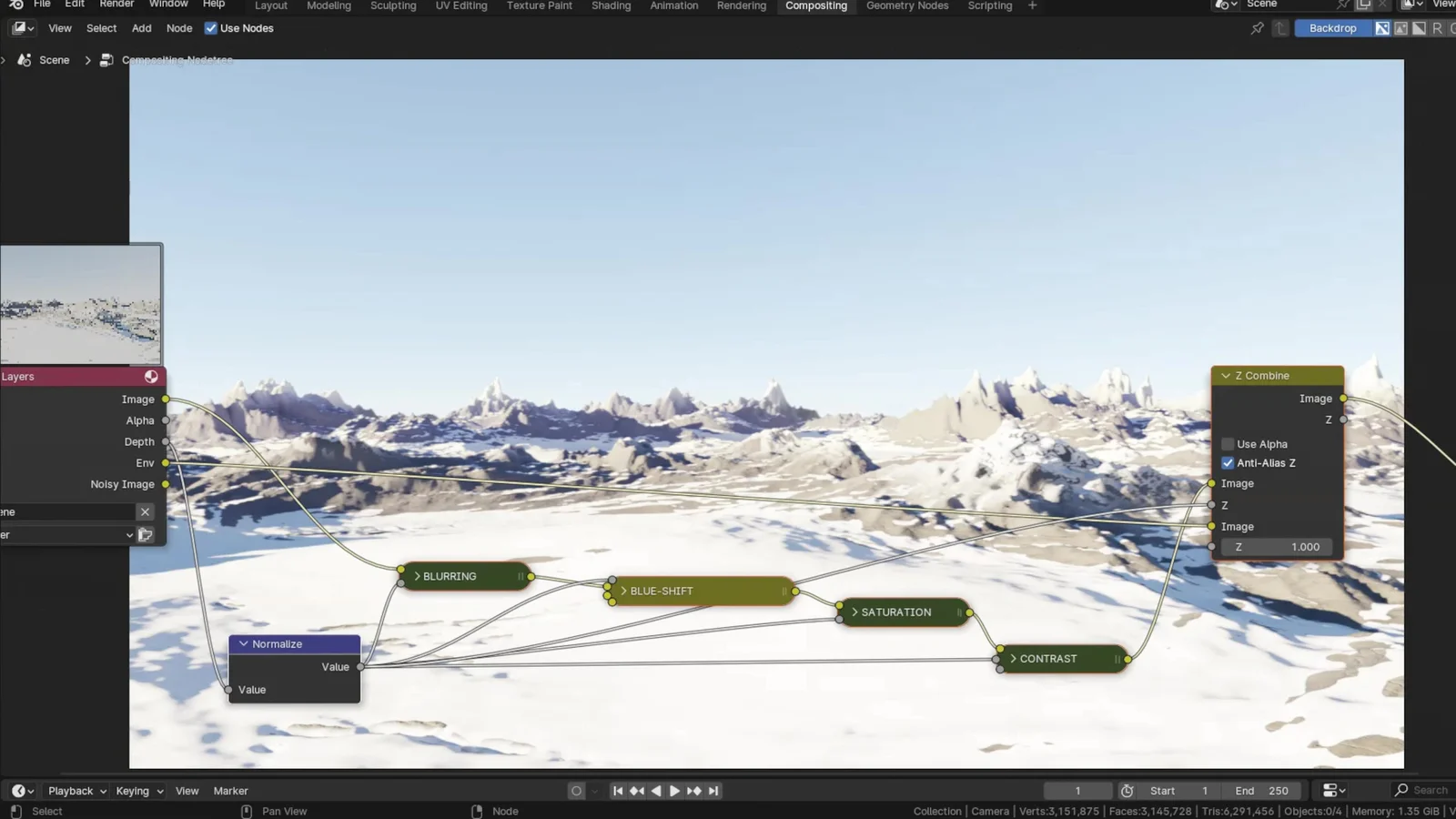 A text-based guide complementing a nine-part video tutorial series on compositing in Blender. The content focuses on utilizing the Depth (Z) pass to create atmospheric and aerial perspective effects in large environments. It covers techniques for creating distance-based masks from the camera to drive various visual adjustments. Effects demonstrated include distance blurring, blue shifting, desaturation, and contrast reduction. The guide also covers technical topics such as camera clipping, normalizing depth, creating compositing node groups, and using the Z-Combine node.