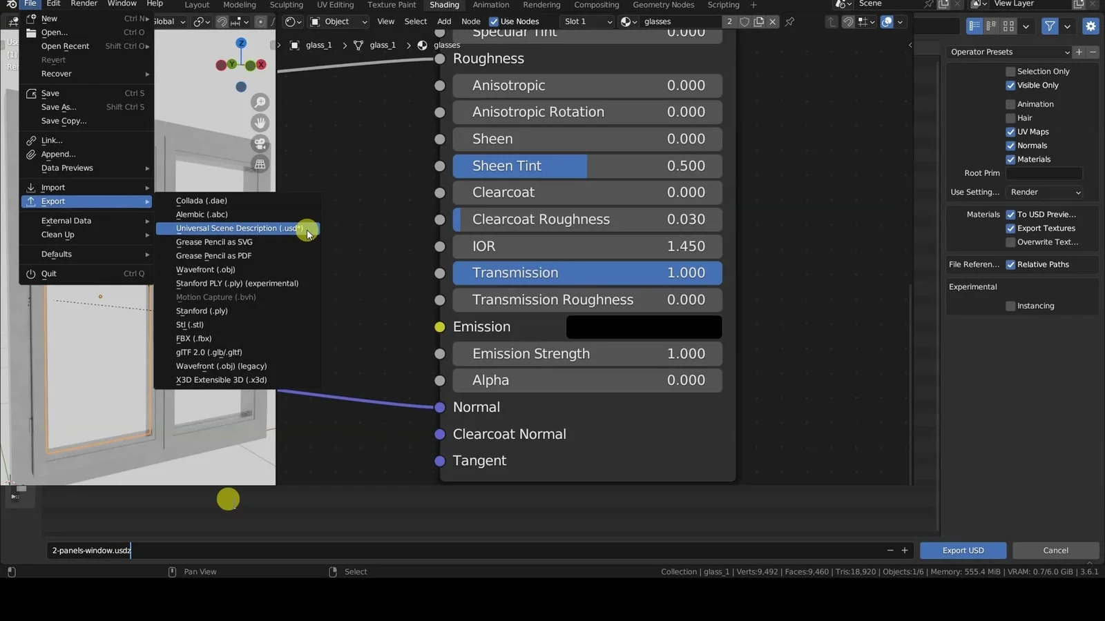 This is a digital PDF guide covering the process of exporting USDZ files with embedded textures from Blender. The tutorial explains the precise material setup required for successful export, including the restriction of using only the Principled BSDF node along with specific Image and Normal nodes. It also details the correct method for handling transparency and alpha settings within the material node tree to ensure compatibility when exporting to the format.