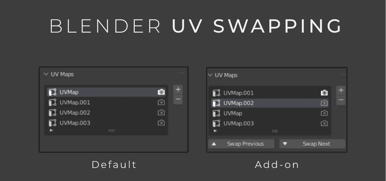 This add-on provides operators to change the internal order of UV maps in Blender. Users can select an existing UV map and use the swap previous or swap next buttons to rearrange them in the list. This process modifies the underlying index of the UV maps, ensuring the correct order is preserved during export when preparing models with multiple UV layouts for external game engines.