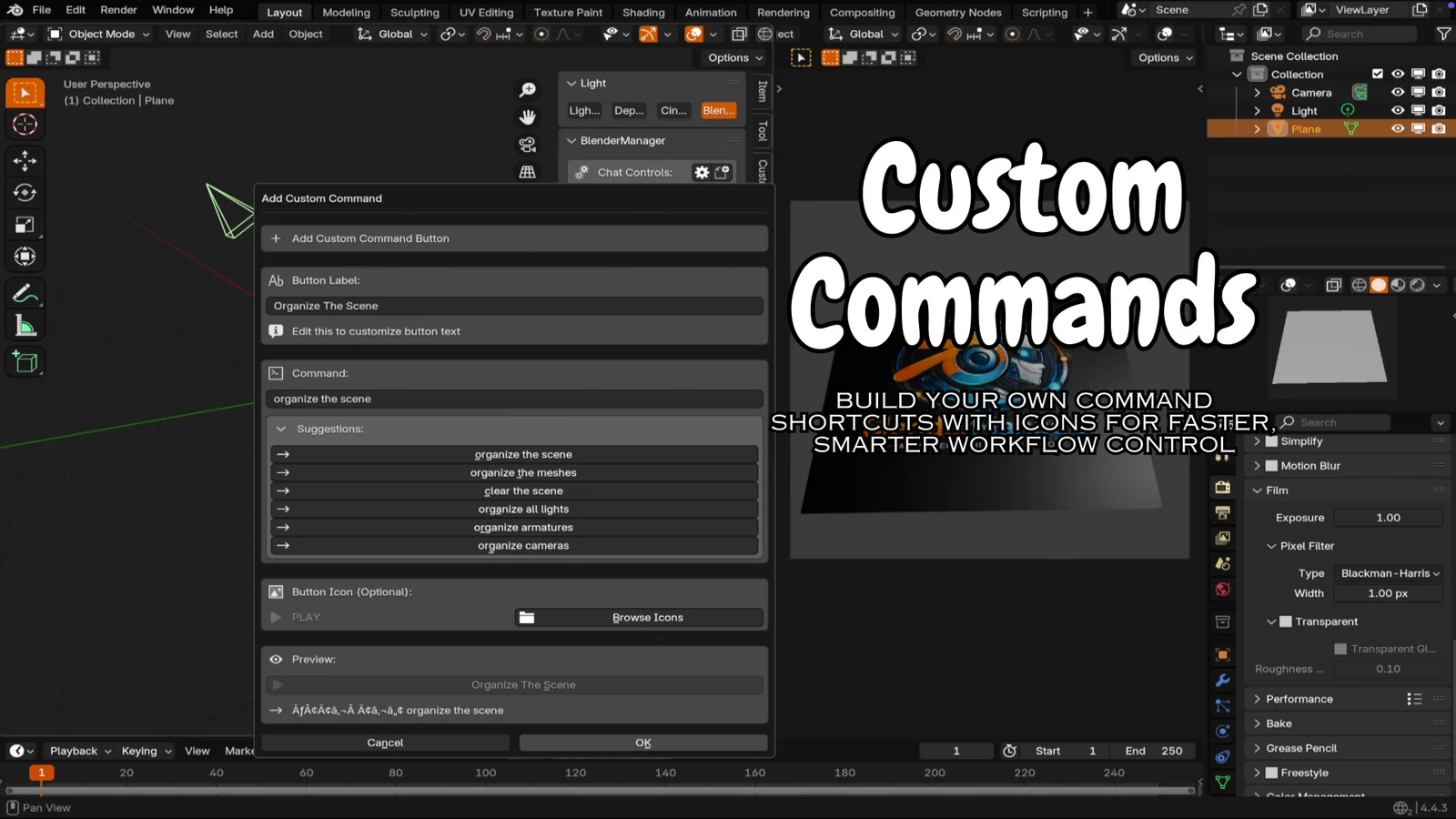 BlenderManager integrates a conversational AI assistant into Blender using Ollama to automate and streamline various 3D workflows. It features a chat system capable of interpreting natural language commands to execute complex Blender operations. The toolkit includes utilities for scene organization, intelligent hierarchy categorization, and automated cleanup of unused data blocks. Additionally, it offers a diverse set of specialized tools such as an OpenCV-powered image tracer for converting raster images to geometry, an AI texture generator, a multi-format batch export manager, and a decal placement system. Users can also configure three-point lighting setups and define custom command shortcuts with personalized icons.