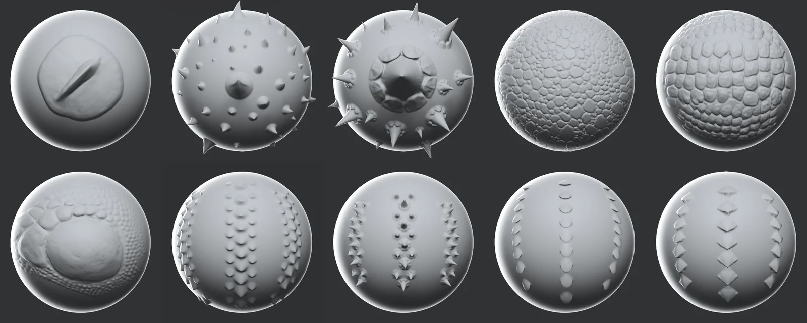 This demo pack includes 10 vector displacement map (VDM) brushes designed for sculpting reptile and dragon details. The brushes allow users to add complex scales, thorns, and reptilian skin features directly to creature sculpts. They are compatible with Blender's sculpt mode (version 3.6 and above) and ZBrush.