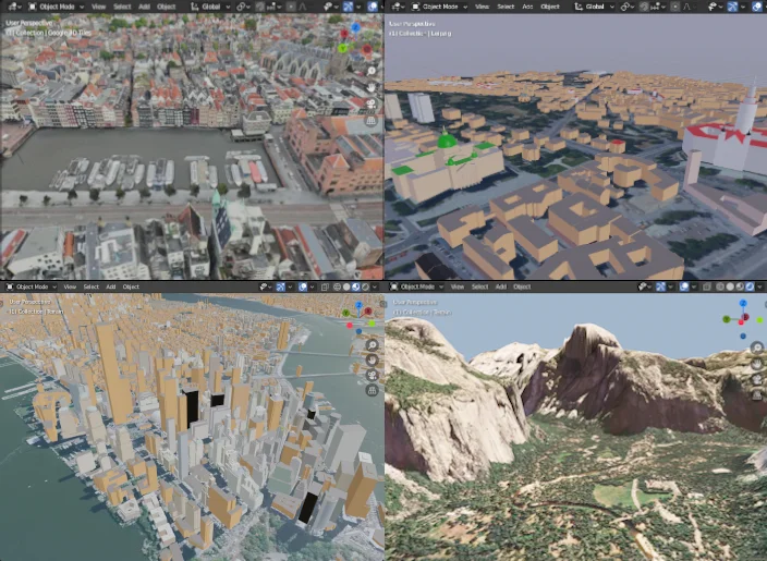 Blosm is an add-on for importing real-world map data directly into Blender scenes. It fetches 3D cities from Google and other providers, as well as terrain data with 30-meter resolution across global coverage.