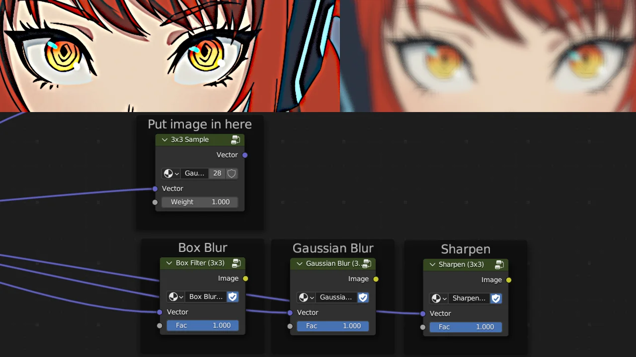 This node setup implements a convolution kernel to provide blur and sharpen effects directly within the Blender shader editor. The smooth blur effect is achieved by sampling the source image nine times, offering functional image processing capabilities while serving as a practical example of node-based convolution techniques.