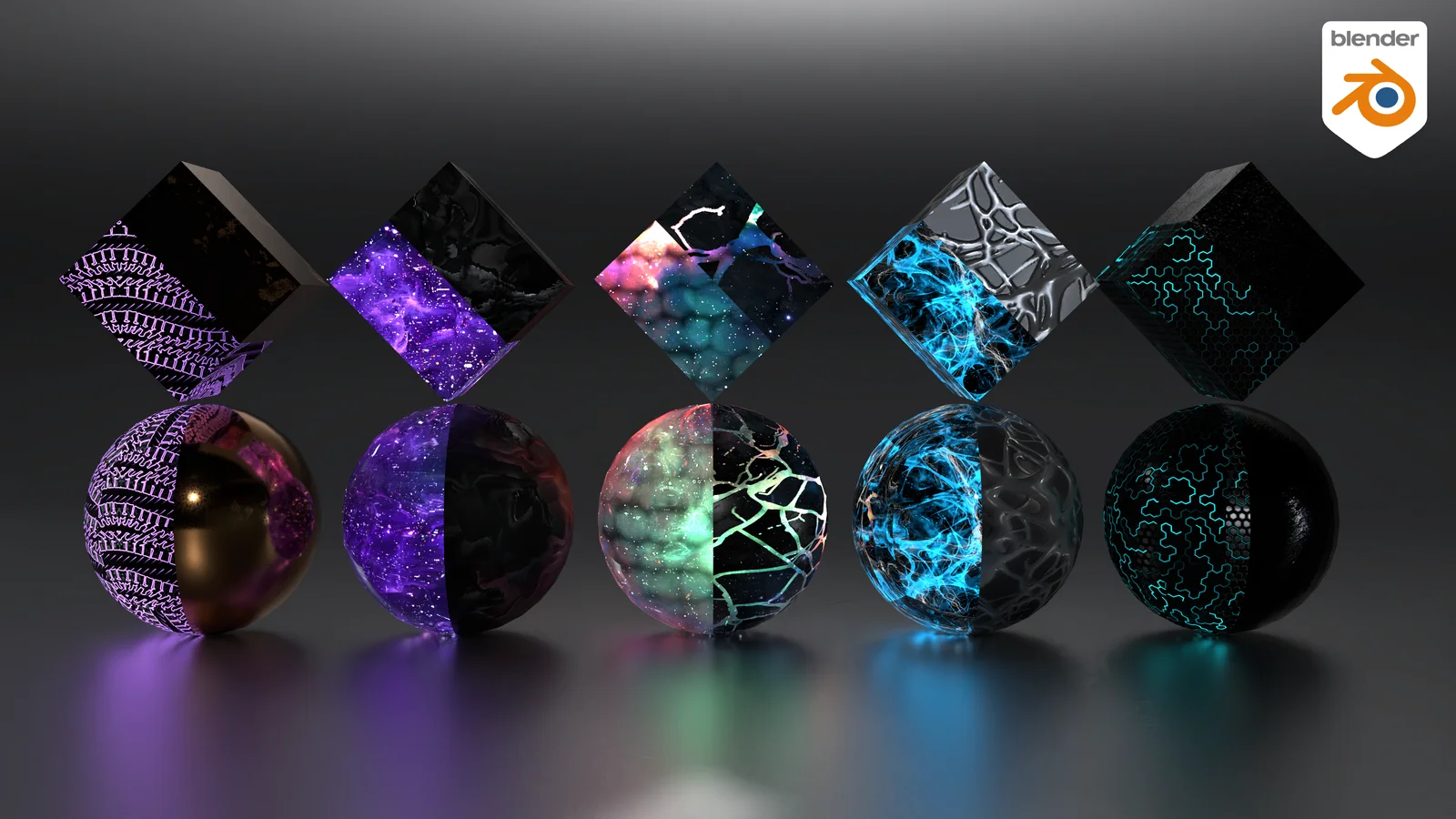 This collection provides a set of procedural camouflage materials built with Blender's shader nodes. The pack includes five animated camo setups featuring Abyss, Dark Matter, Nebula, Catalyst, and Dark Spine styles. Additionally, it contains older procedural versions of Dark Matter, Diamond, and Reflect 115 designs, along with three pre-shaded examples to demonstrate the material configurations.