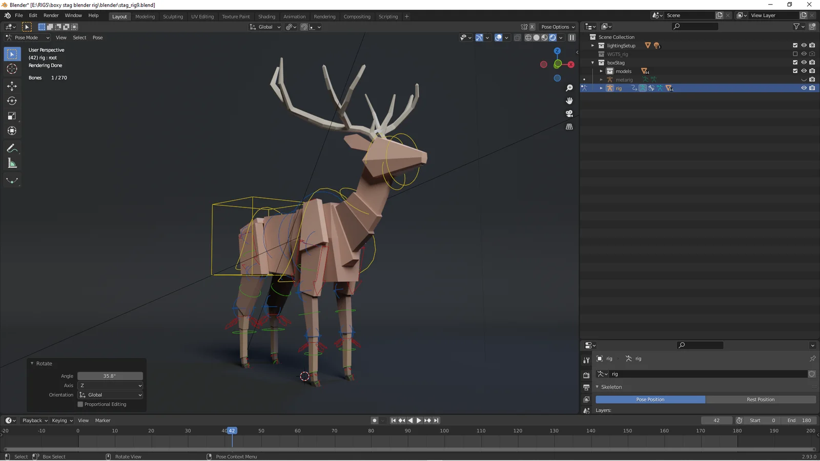 A rigged 3D model of a stylized, blocky stag character designed for animation in Blender. The model features a custom armature and is prepared for rendering with the Cycles engine. The rig does not include pre-made animations.