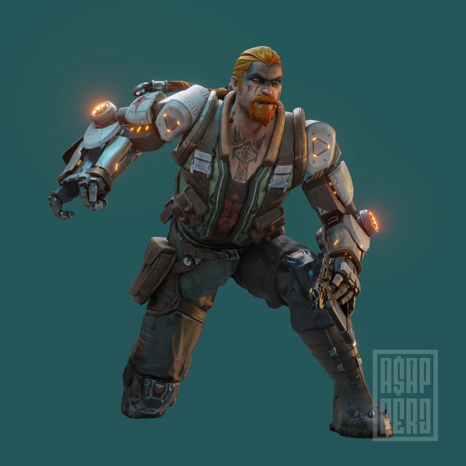 This product provides a rigged 3D model of the character Breach from Valorant, designed for use in Blender. The rig includes both IK and FK controls, custom control shapes, and pre-configured ability actions. The character is built to be compatible with Mixamo animations. It features 4K resolution textures with custom properties available to modify the visual appearance. A model of the Ragnarocker Frenzy weapon is also included in the package.