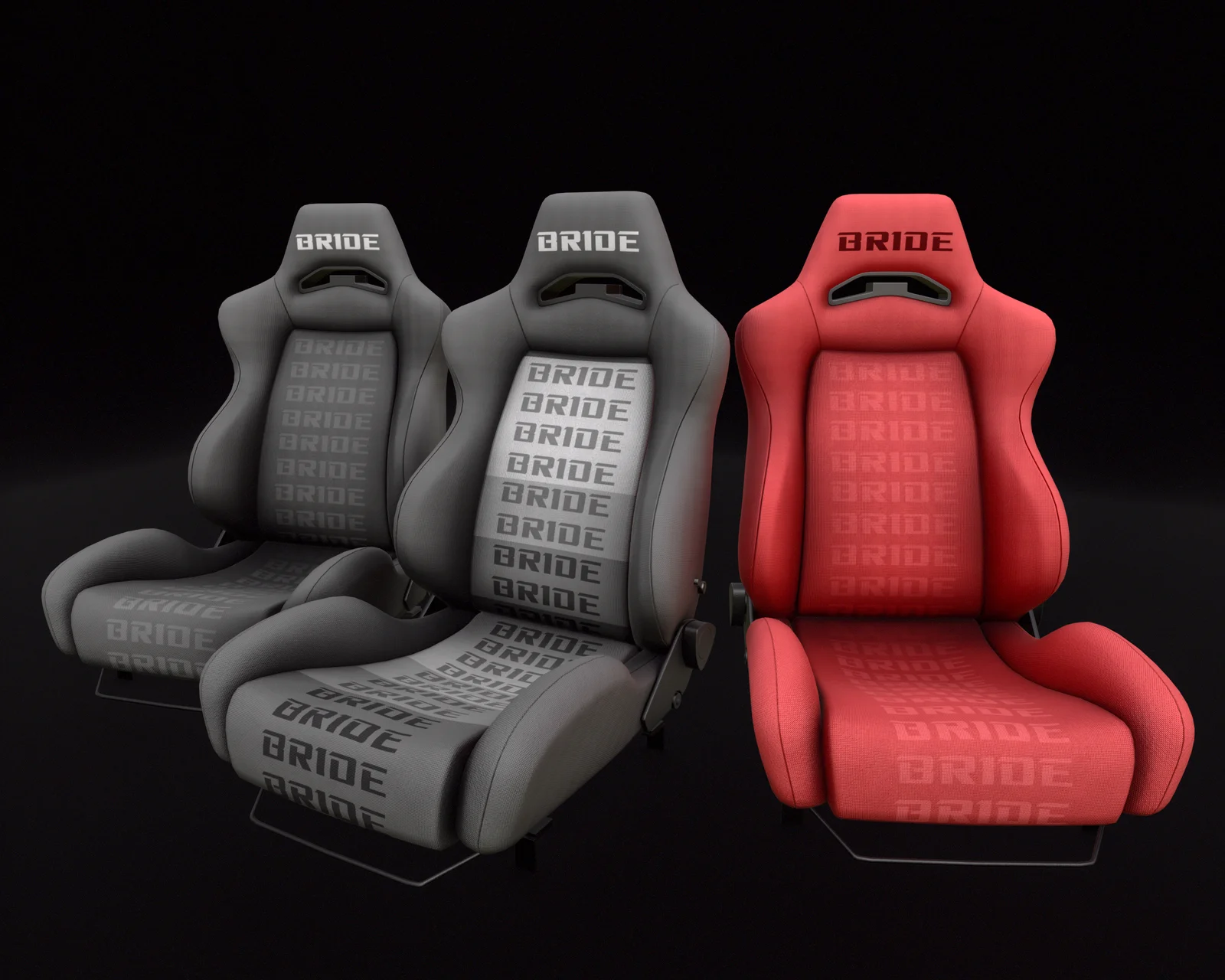 A 3D model of a Bride Ergo racing seat created from a 3D scan. The model consists of 25,884 triangles and includes PBR textures. It comes with three distinct color variations: black, black-grey, and red.