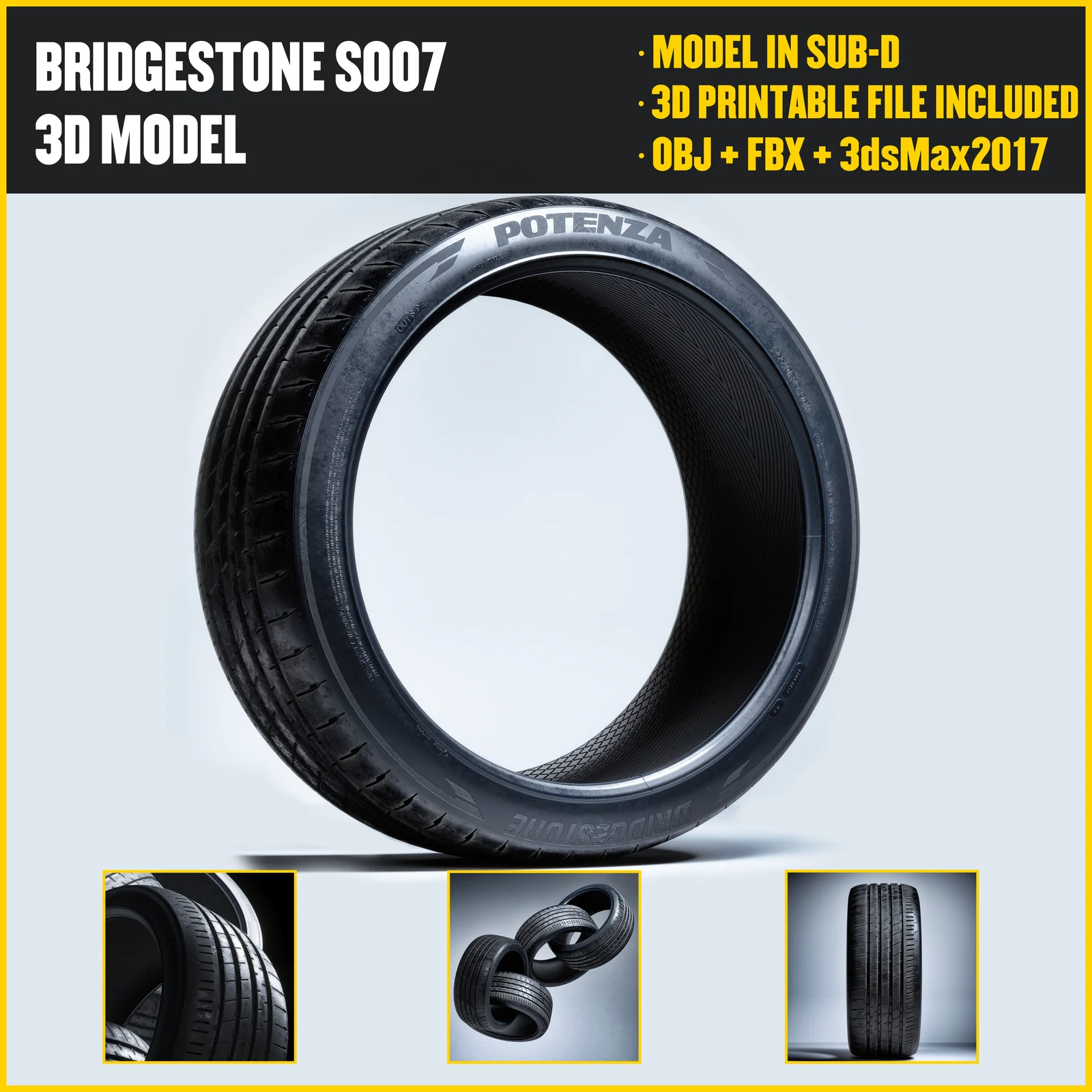 A high-resolution 3D model of the Bridgestone Potenza S007 tire, designed using subdivision surfaces. The model features fully unwrapped treads and sidewalls, accompanied by 4K PBR textures. It is built to real-world scale using centimeter units, with the axis set at the origin for straightforward animation integration. The asset includes both high and low polygon exports.