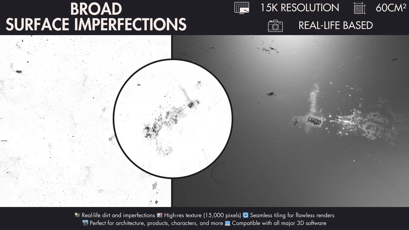 This product provides a high-resolution surface imperfection texture designed to add subtle realistic details like dust, smudges, and hair to 3D materials. The texture is created from photographs of real-world dirt and is provided at a 15,000-pixel resolution covering a 60cm physical scale. It is designed to be seamlessly tileable across broad surfaces without noticeable repetition, making it suitable for architectural visualization, product rendering, and general material authoring. As an image-based resource, it is compatible with all major 3D software and render engines.