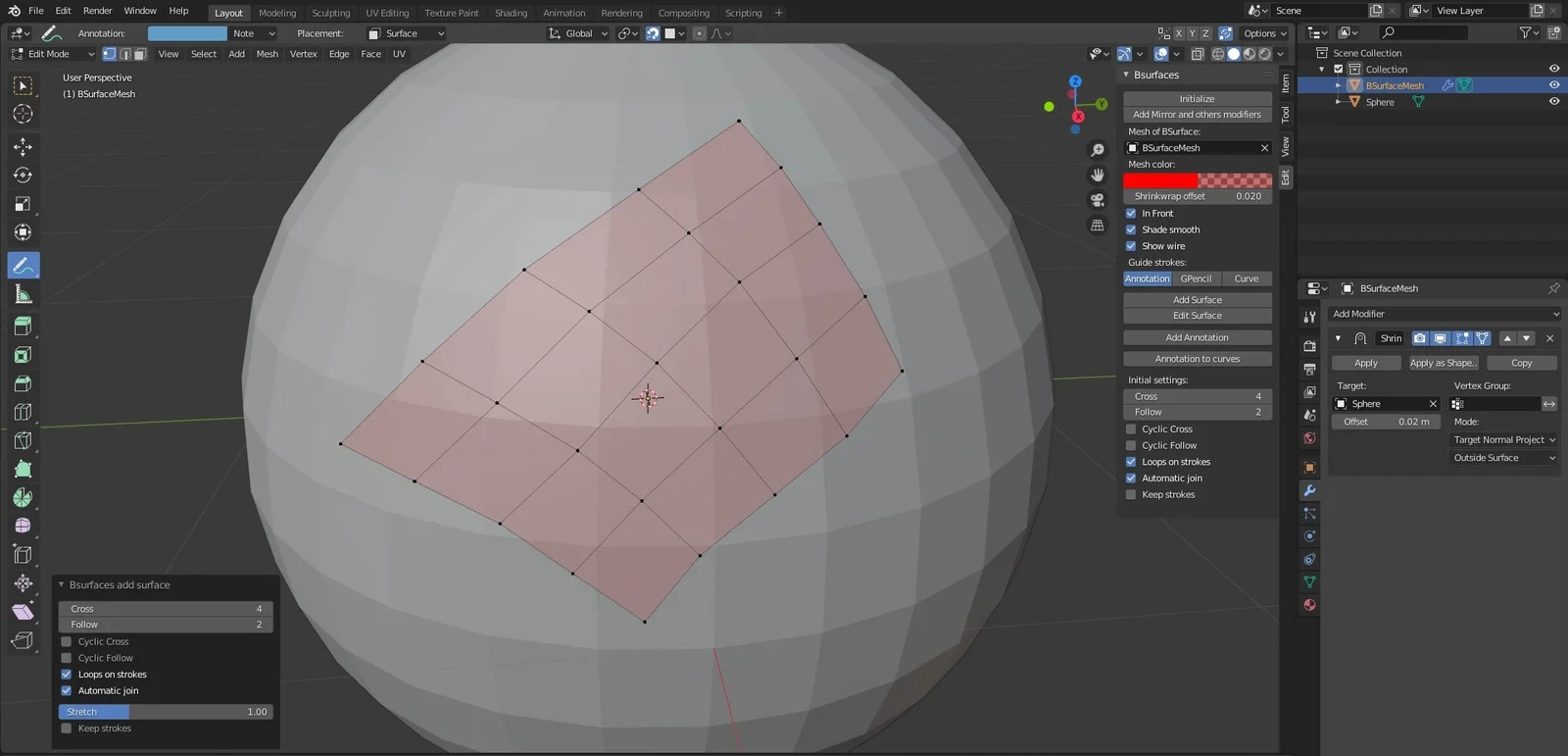 BSurfaces is a modeling and retopology tool that generates polygonal surfaces using freehand strokes, annotations, bezier curves, or loose edges. It integrates into traditional polygonal and subdivision modeling workflows to assist with creating both open and closed shapes.