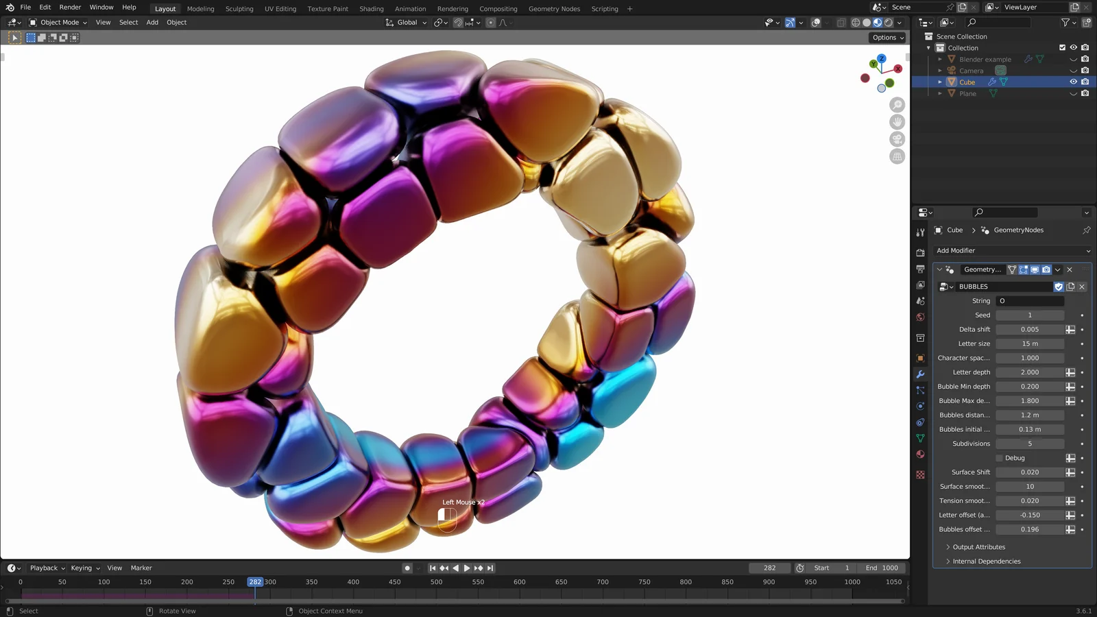 A Geometry Nodes setup that generates a dynamic bubble-filling effect inside text and shapes. The simulation procedurally populates the interior volume of letters with expanding spherical geometry over time. This tool can be used to animate typographic reveals or to generate static meshed structures, such as irregular packed cobble walls and cellular patterns.