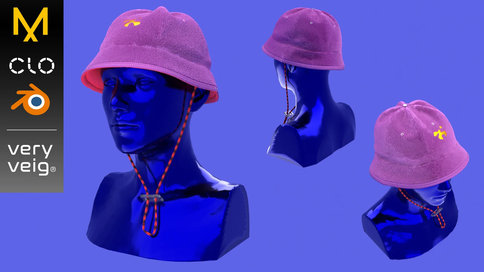 This is a 3D model of a bucket hat. The base garment geometry was engineered using Marvelous Designer and Clo3D. The provided Blender file is fully configured with a fur particle system and a ready-to-render scene. Standard 3D exports and native project files are included for further modification.