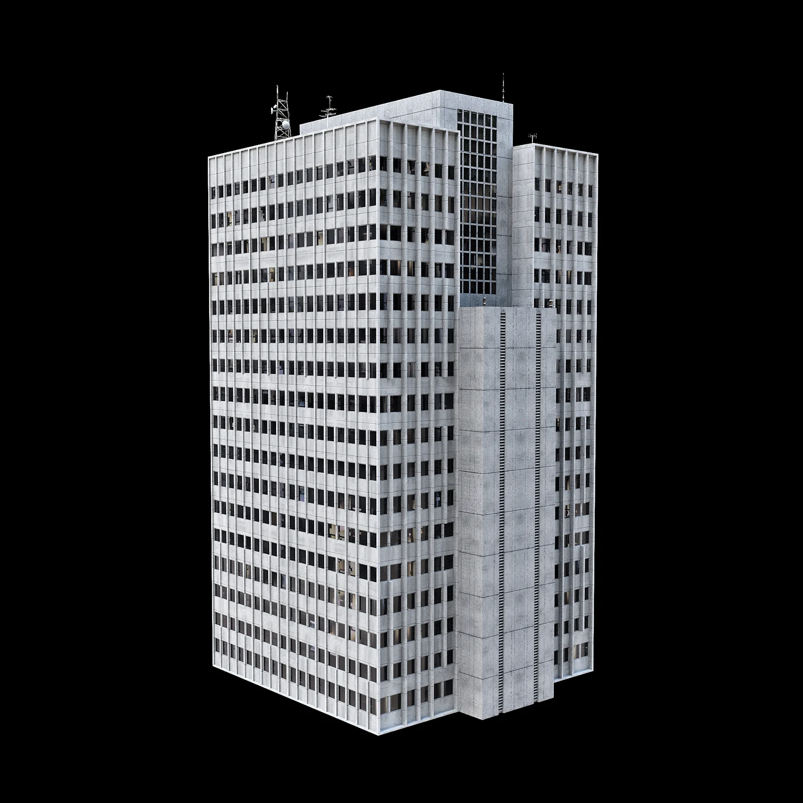 This asset provides a single textured 3D model of a skyscraper. It is intended to populate exterior scenes, serving as a background environment element in architectural visualization projects or futuristic science fiction scenes. The geometry and materials are provided in a native Blender file.