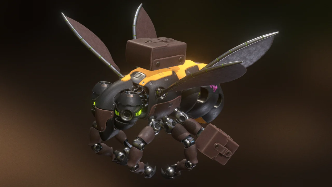 A 3D model of a pollinator drone designed to resemble a bumble bee. The asset is composed of 345,190 quads and divided into 38 unique meshes. It includes six materials utilizing 20 square textures up to 2K resolution. The model also features vertex colors and includes one animation track.