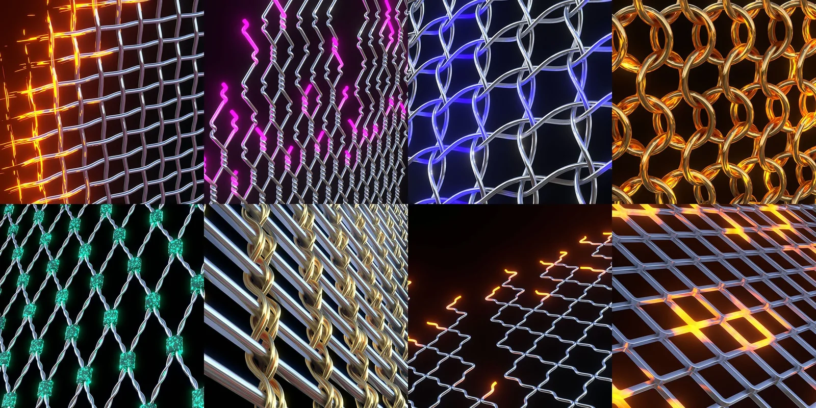 A collection of eight distinct procedural wire netting setups built using Geometry Nodes. The download provides individual project files for each netting type, alongside a shared source image folder containing an HDR environment map for basic scene lighting.