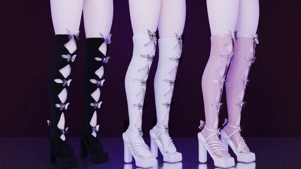 A rigged 3D model of butterfly-themed high heels. The asset is provided in both FBX and standard Blender formats, allowing for integration into various character setups. The model consists of 38,378 vertices and utilizes two materials. The underlying character body mesh is not included.
