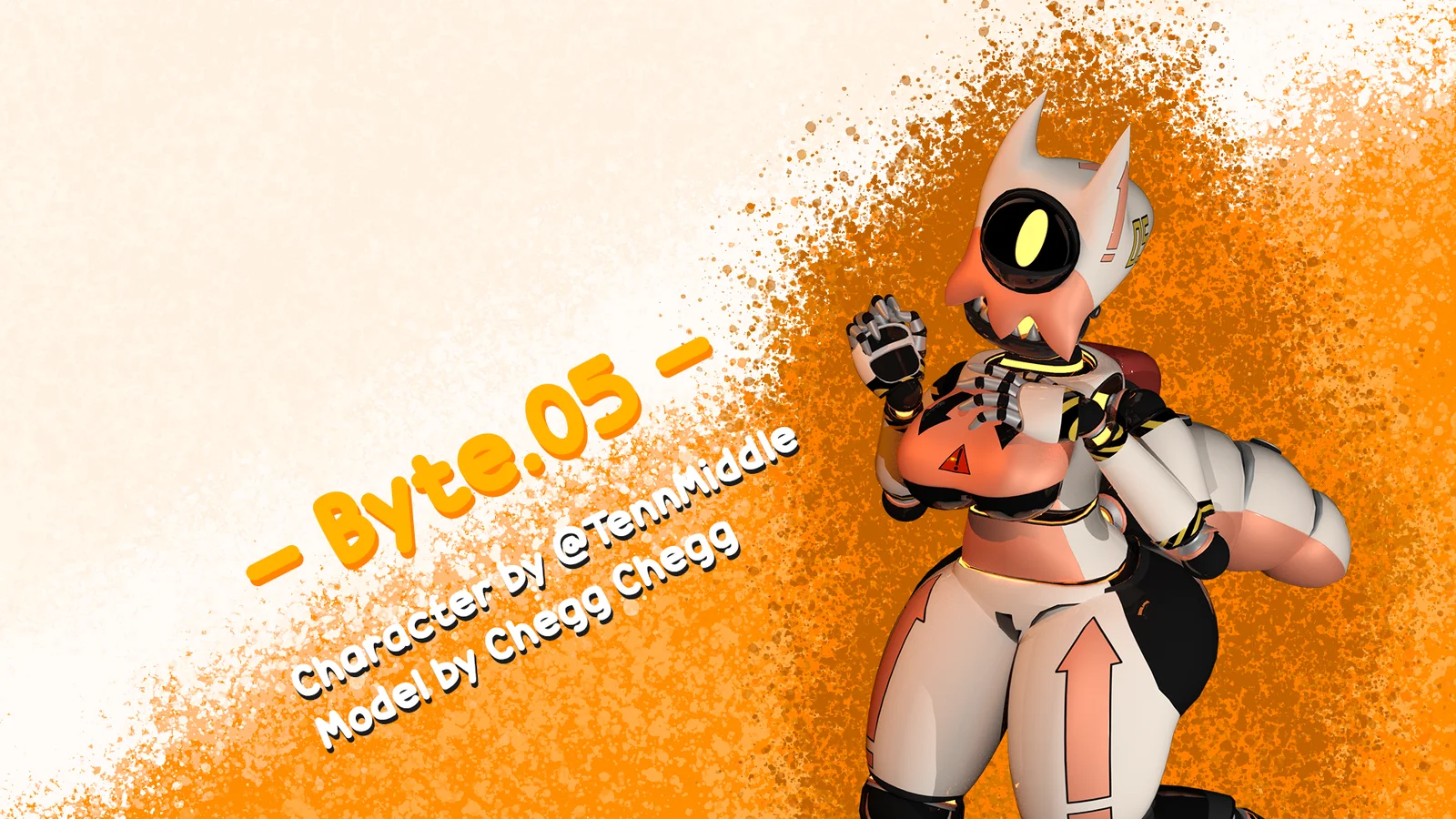 Byte.05 is a rigged worker robot 3D model featuring a light cream-colored body with orange metallic accents and neon lighting. The character design includes distinct details such as two small horns, a single eye with a large oval pupil, faceplate teeth, a bug-like abdomen tail, and a small backpack. The asset is provided as a rigged FBX file with accompanying textures, prepared for posing and animation.