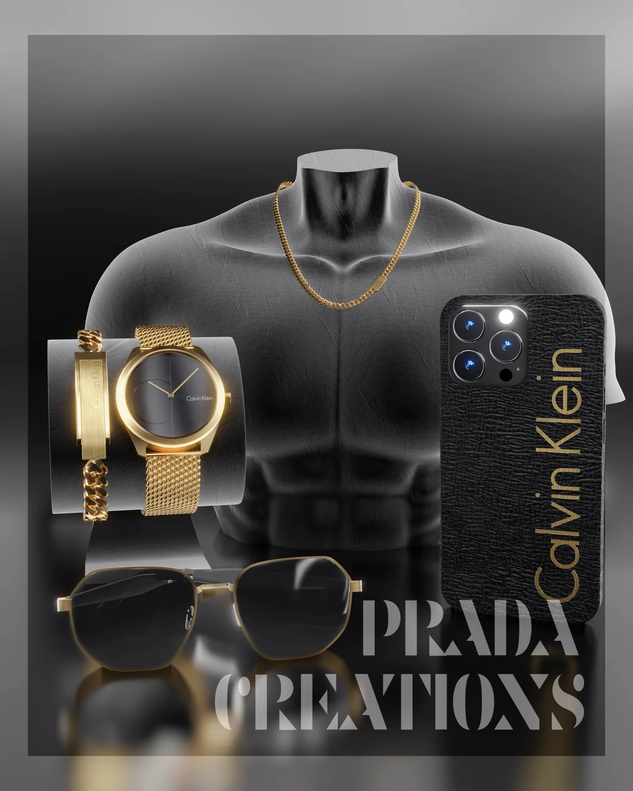 This collection provides a set of Calvin Klein brand 3D accessories intended for use in Blender. The pack includes phone cases along with jewelry and eyewear that are rigged for use with character simulations. Specifically, it contains rigged watches, bracelets, a necklace, and sunglasses. The models are designed to be compatible with both the Cycles and EEVEE render engines.