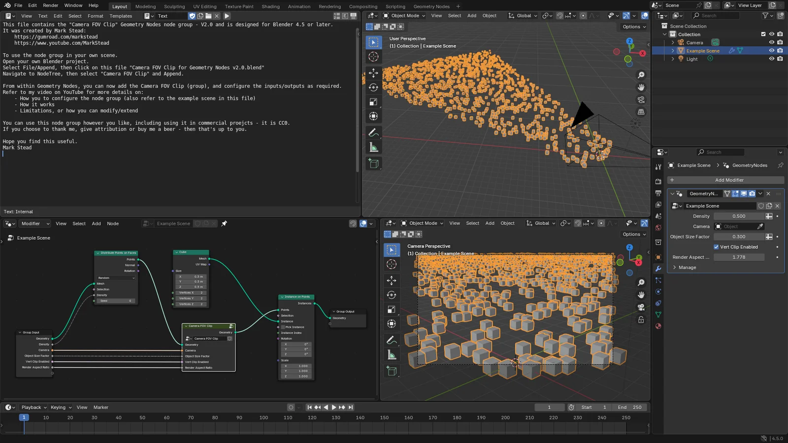This Geometry Nodes setup optimizes large-scale scenes by automatically culling points that fall outside the active camera's field of view. It is designed for projects that scatter thousands of objects, such as vegetation, rocks, or debris, reducing the processing load on your hardware. By removing unseen geometry before it is evaluated, it helps improve EEVEE render times, viewport navigation frame rates, and Cycles memory usage.