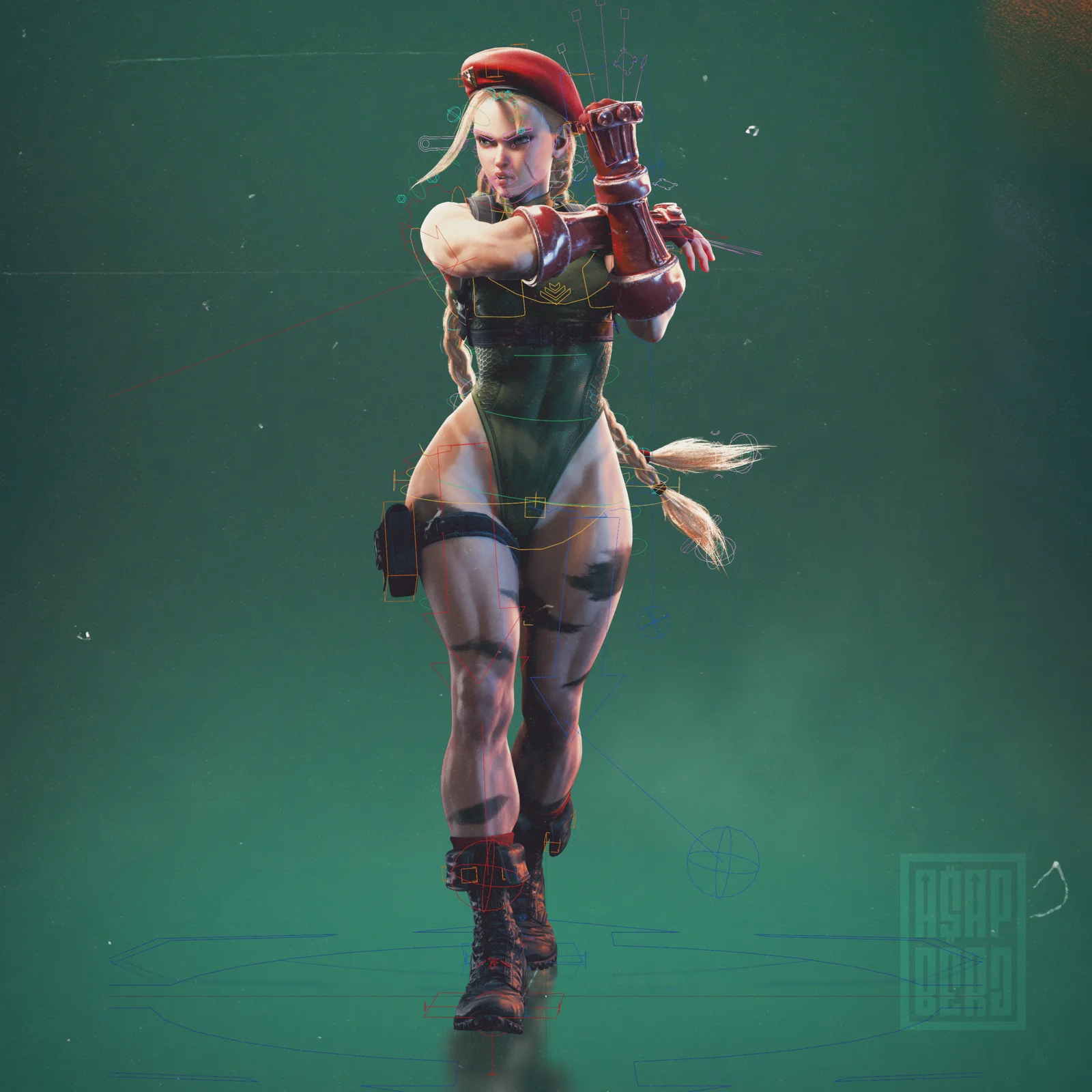 This is a custom Rigify character model of Cammy from Street Fighter 6, configured for both Cycles and EEVEE render engines. The rig includes IK and FK systems for the limbs with elbow and knee pinning, alongside a stretchable torso featuring tweak controls and a custom pivot. It also features a fully functional custom facial rig with automated action controls and individual tweak properties.
