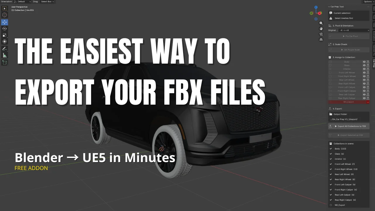 In addition to transform cleanup, the add-on analyzes physical dimensions and ensures a correct 1:1 scale. It provides an automated collection management system that sorts components into standardized categories like wheels, body, glass, calipers, and interior parts. For export, it offers a smart FBX workflow that can either output collections as separate files or consolidate selected components into a single FBX, configuring properties like orientation, geometry, and smoothing automatically.