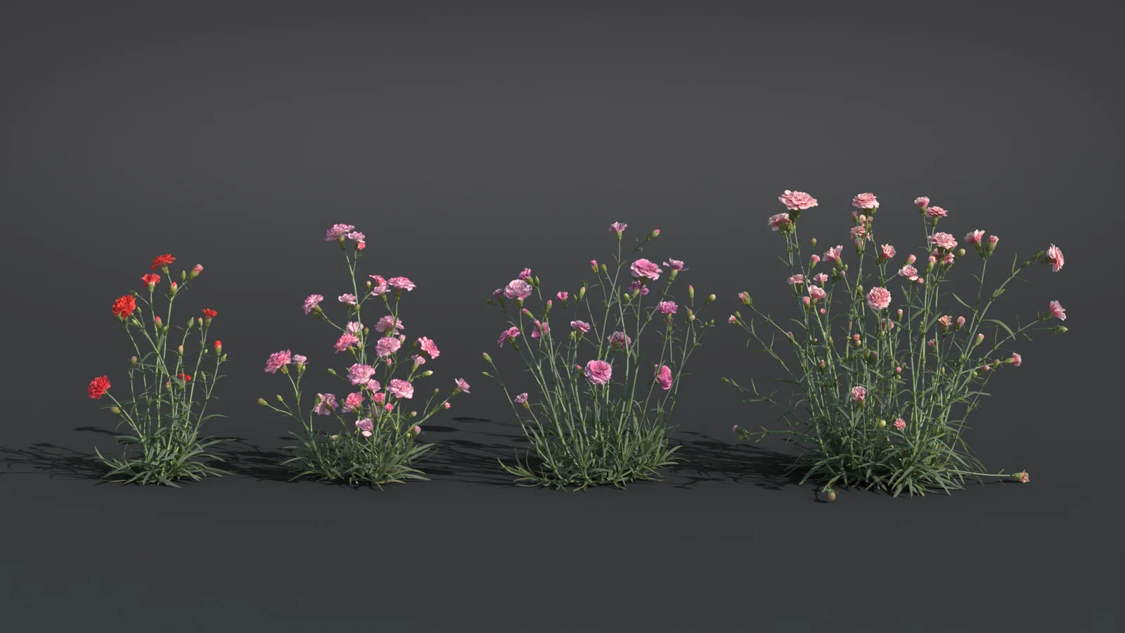 This is a collection of nine carnation flower 3D models, provided in high, medium, and low polygon variants. The models are built to real-world scale and include 20 PBR texture maps available in 2K and 4K resolutions. The package contains 30 objects in total, featuring overlapping unwrapped UVs without rigging or animation. It includes native Blender project files alongside FBX and OBJ formats for general compatibility.