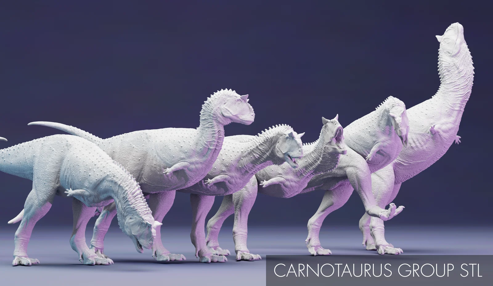 This collection provides 3D printable Carnotaurus models in six distinct poses. The files are delivered in STL format with a native scale of 1/40, though they can be resized depending on the printer's capabilities. Each of the six poses includes both a solid single-piece version and a version split into four parts for easier assembly. The models are supplied unsupported.