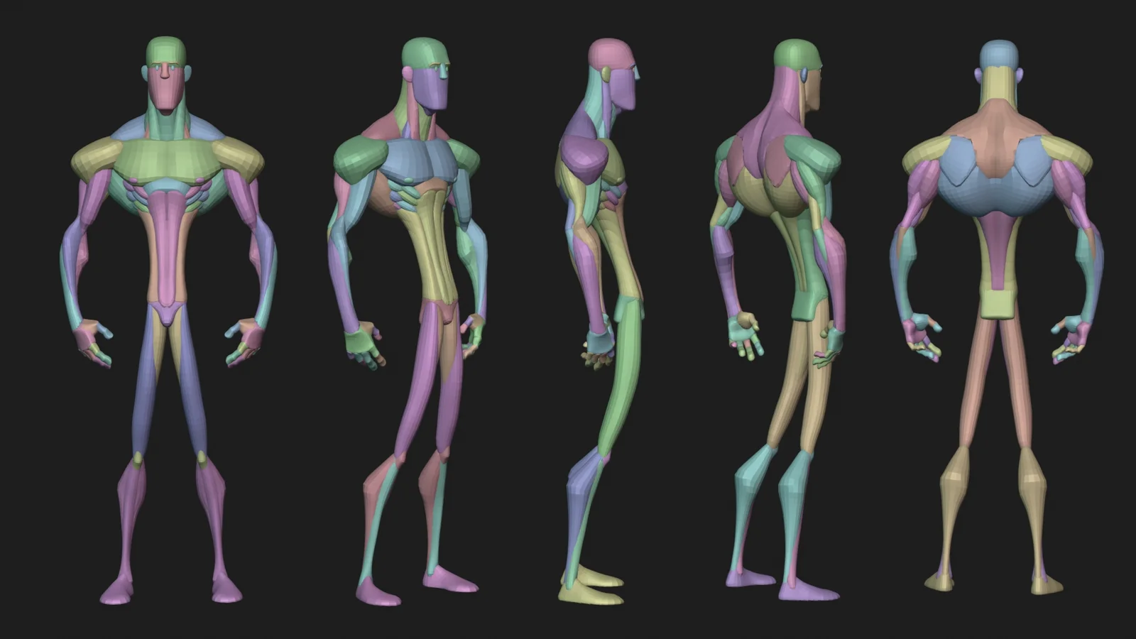 A stylized male human anatomy blockout model designed to serve as a base mesh for character creation projects. This asset acts as a starting point for further sculpting or modeling work. The underlying geometry is organized into distinct sections, separating the torso and head, arms and hands, and legs and feet. It is provided in BLEND, FBX, and OBJ formats.