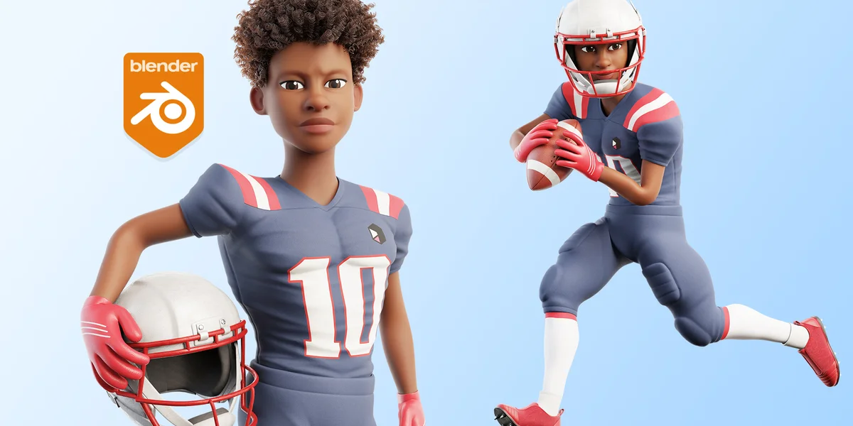 This product provides a fully rigged 3D character model of an American football player designed with a stylized aesthetic. The character features a comprehensive facial and body rig, including 52 ARKit-compatible blendshapes for facial animation and lip-syncing. The character's hair is constructed using Geometry Nodes.