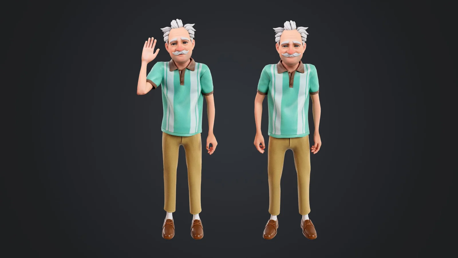 A rigged 3D character model of a cartoon-style old man. The mesh features clean, quad-based topology and is fully UV unwrapped. It includes a complete armature framework for both the body and face, utilizing blendshapes to drive facial expressions. The asset package includes 74 high-resolution textures provided as JPG and PNG files. Model data is supplied in FBX format containing the skeleton skin and blendshapes, alongside a standard OBJ export.
