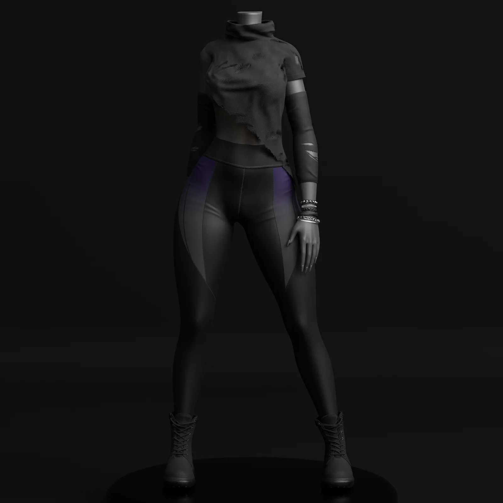 A collection of five rigged 3D clothing assets designed for character models. The set includes boots, arm sleeves, a ripped top, a choker with bracelets, and leggings. Each asset is provided as a rigged FBX file with PBR textures and uses a single material slot. The clothing was modeled to fit Zinpia's RP Female Base.