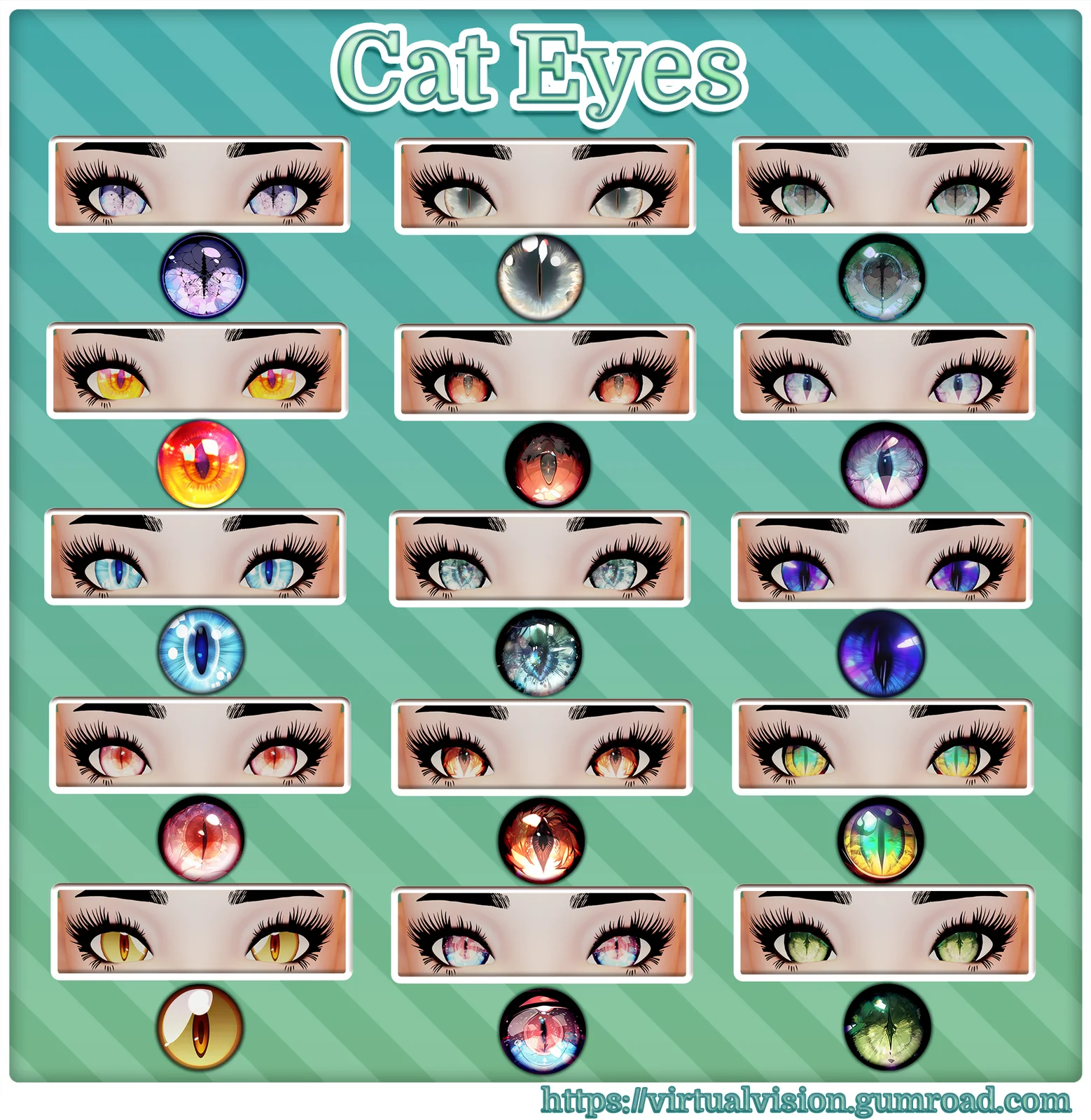 A collection of 15 abstract themed cat eye textures designed for 3D character models and avatars. The pack provides image files in PNG format, which were generated using AI and manually edited.