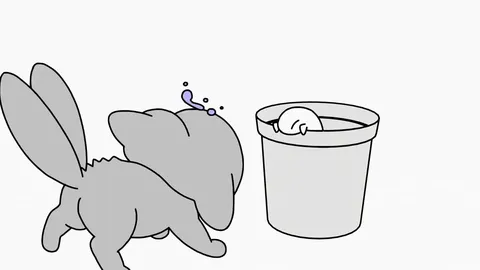 A hybrid animation scene created in Blender that combines two-dimensional and three-dimensional elements. The project file includes a 3D bucket model integrated with 2D character animations, serving as an example of mixed-media animation techniques.